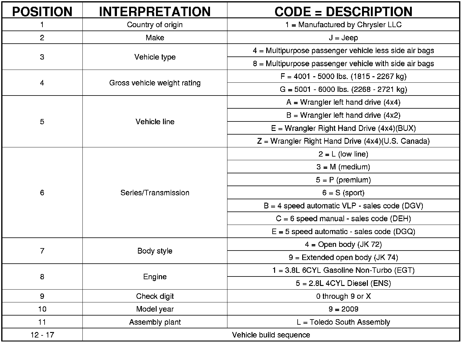 VEHICLE IDENTIFICATION NUMBER DECODING CHART