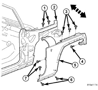 8. After correct fender gap and flush specifications are obtained, tighten all the upper fender fasteners (1, 3, 4 and 7) to 5 Nm (45 in. lbs.).