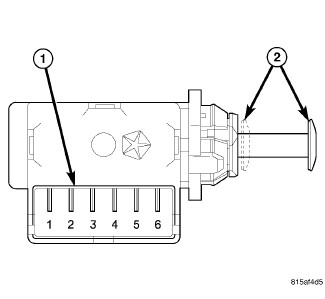 3. Using an ohmmeter, perform the continuity tests at the terminal pins (1) in the brake lamp switch connector receptacle as shown in the Brake Lamp Switch Tests table.