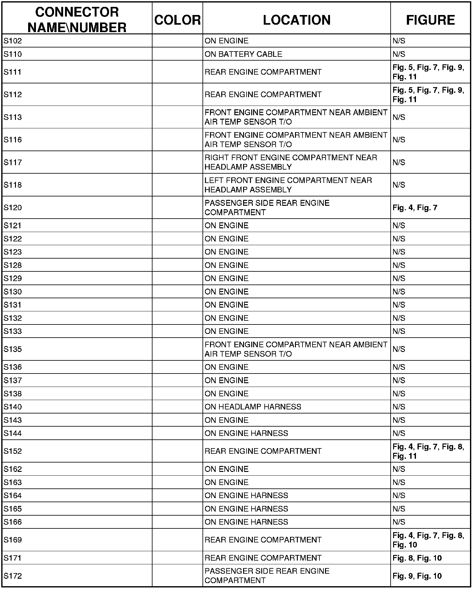 The abbreviation T/O (Take Out) is used in the location column to indicate a point in which the wiring harness branches out to a component.