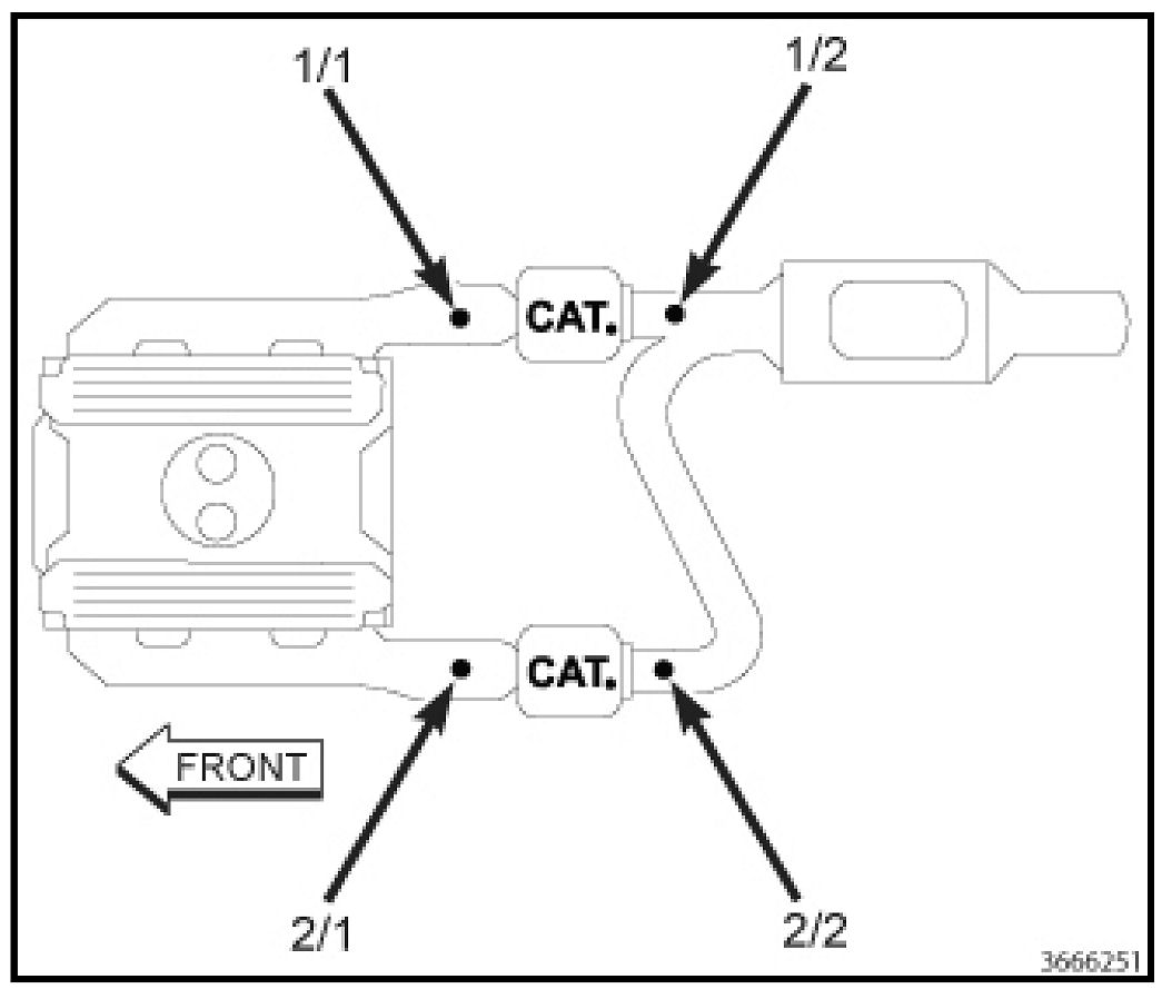 The right upstream O2 sensor is referred to as the 1/1 sensor. The right downstream O2 sensor is referred to as the 1/2 sensor.