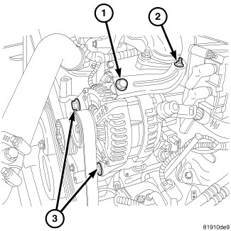 3. Remove generator mounting bolts (1) and (3). Remove nut (2),