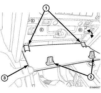 5. Engage the two tabs (1) at the bottom of the lower center trim panel (3) into the receptacles in the base trim of the instrument panel center stack and roll the top of the panel upward.