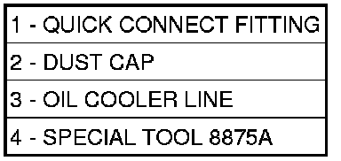 4. Slide the dust cap (4) down the transmission cooler line and snap it over the quick connect fitting until it is fully seated and rotates freely. The dust cap will only snap over the quick connect fitting when the transmission cooler line is properly installed.