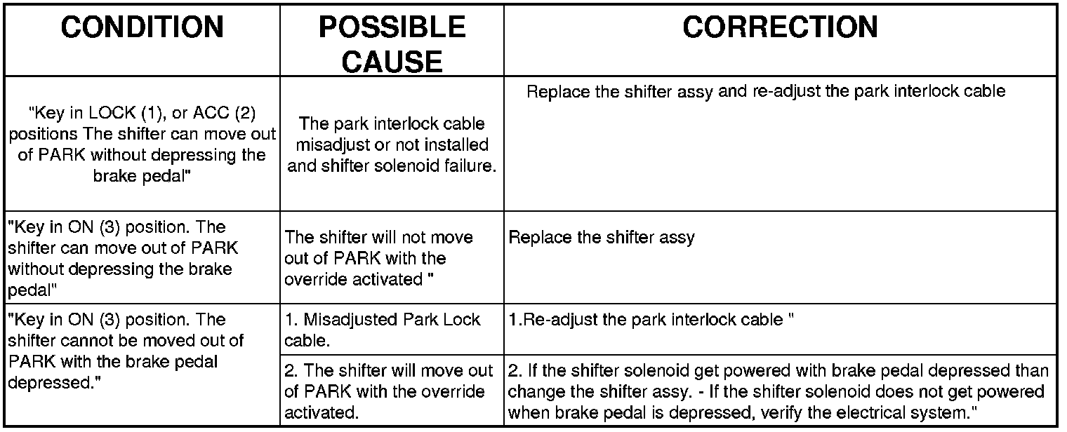 1. Shifting out of PARK should not be possible when the key is removed, or in LOCK (1) or in ACC (2), regardless of the brake pedal position.