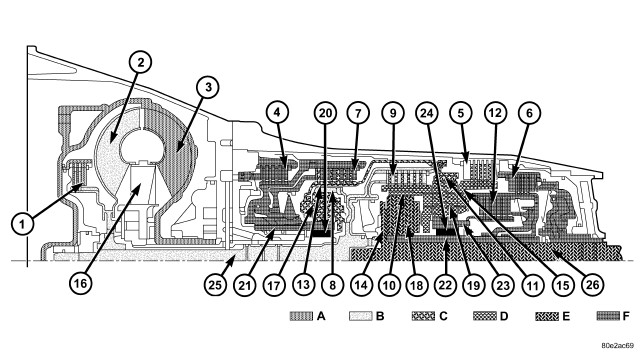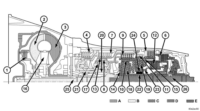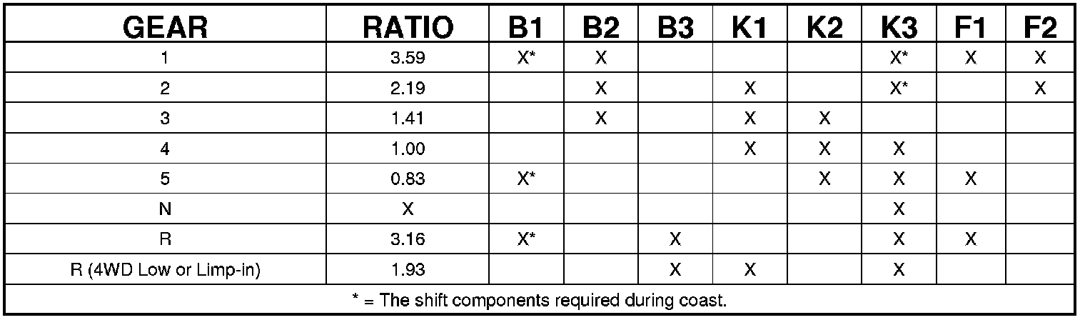 Refer to CLUTCH APPLICATION for which shift elements are applied in each gear position.