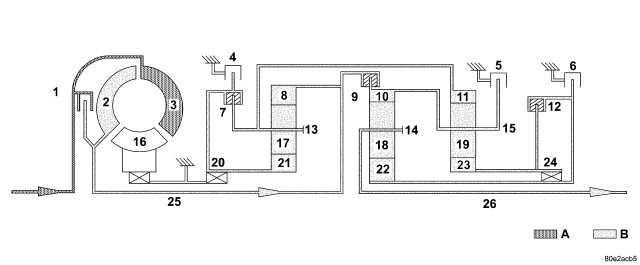 The selector valve opens the shift pressure (p-S) feed connection from the ball valve (19) with the shift valve B2 (9). With the shift valve B2 (9) in the upper position, shift pressure (p-S) travels behind the piston B2 (5) and simultaneously to the opposing face of the piston B2 (6). The multiple-disc holding clutch B2 begins to close.