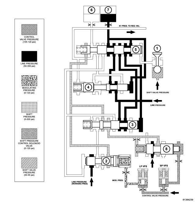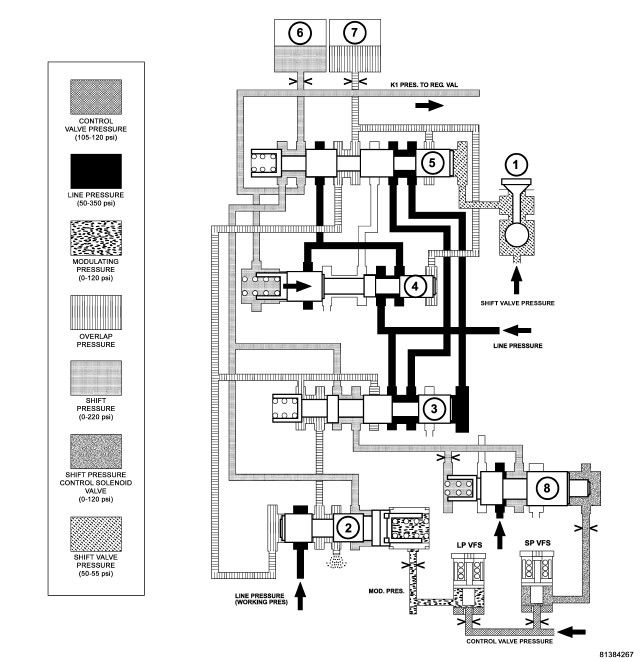 - The modulating pressure and shift pressures rise to the maximum levels.