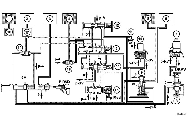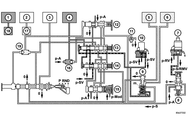 The B1 (7) pressure acting on the end face of the shift pressure shift valve (3) is replaced by the working pressure (p-A). The shift pressure is also routed to the spring end of the holding valve (4) and the holding valve downshifts. The line pressure is then routed to the command valve (5).