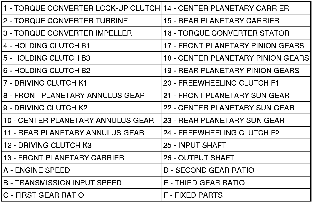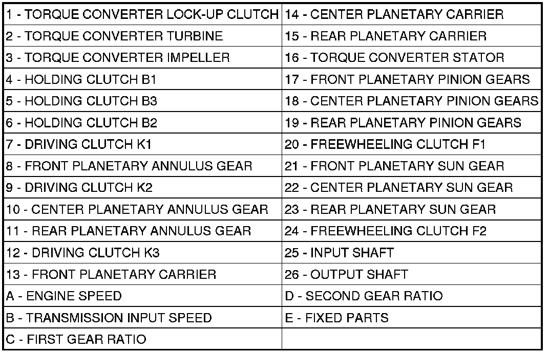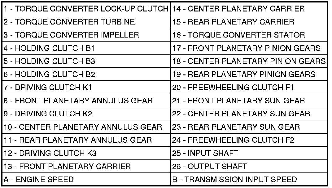Torque from the torque converter is increased via the input shaft (25) and the center and rear planetary gearset and transferred to the output shaft (26).