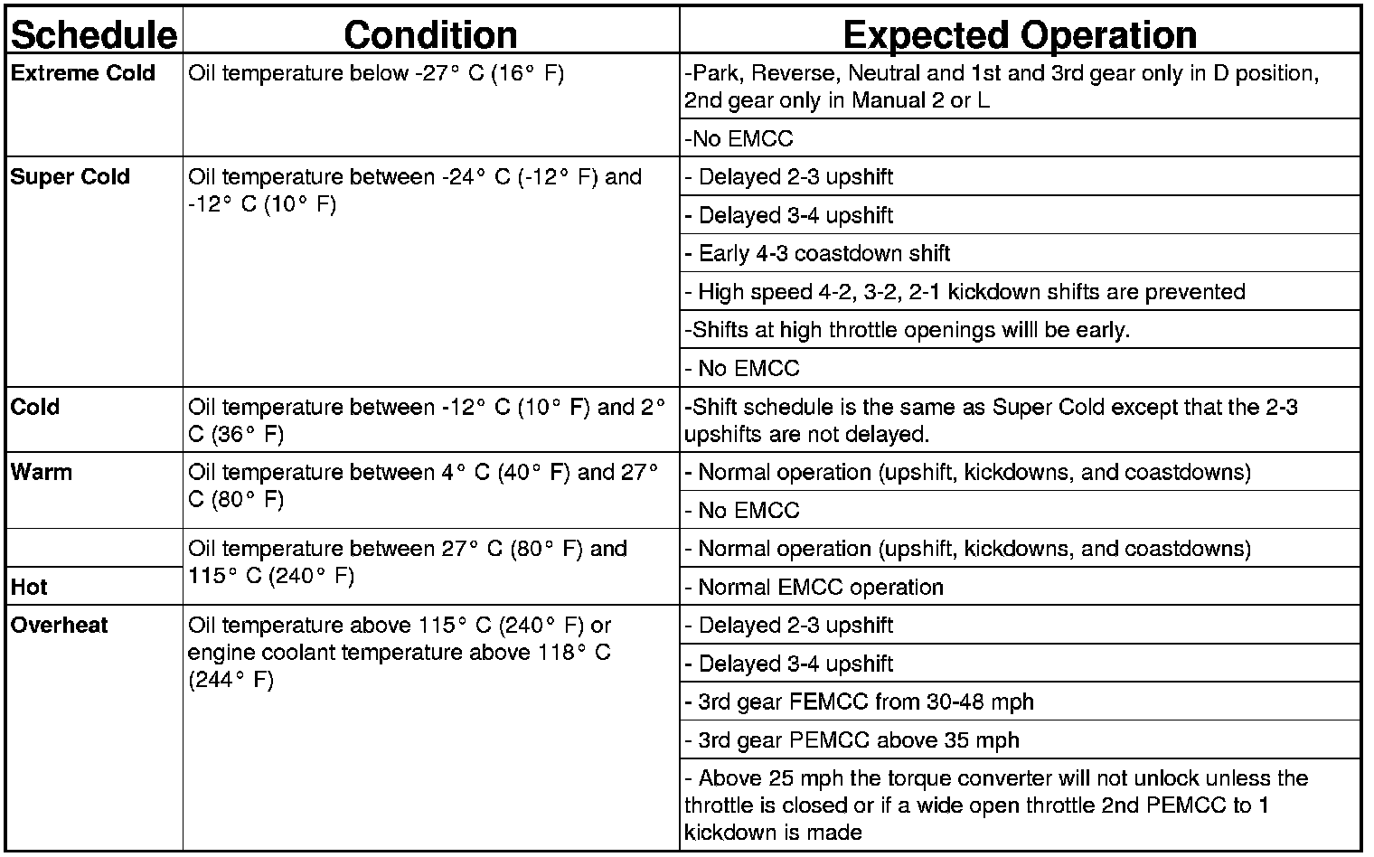 As driving conditions change, the TCM appropriately adjusts the shift schedule. Refer to the following chart to determine the appropriate operation expected, depending on driving conditions.