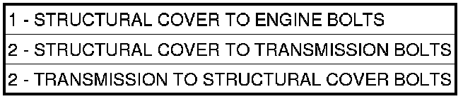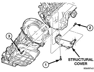 CAUTION: The structural dust cover must be held tightly against both the engine and the transmission bell housing during the tightening sequence. Failure to do so may cause severe damage to the cover.