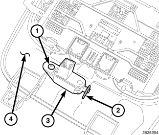 1. Position the infrared sensor (3) onto the back of the overhead console (4). Align the slot on the sensor with the retaining tabs (2) on the console.