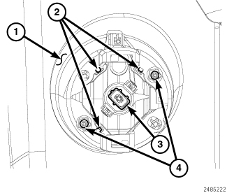 3. Reach up behind the front fascia to install and tighten the two screws (4) that secure the lamp to the back of the fascia. Tighten the screws to 2 Nm (14 in. lbs.).