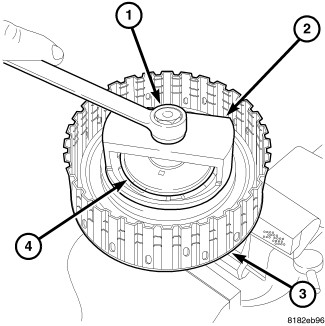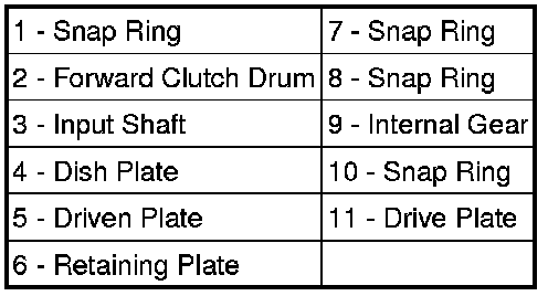 4. Remove the retaining plate (1), the drive and driven plates (3), and the dish plate (2) from the forward clutch drum (4).