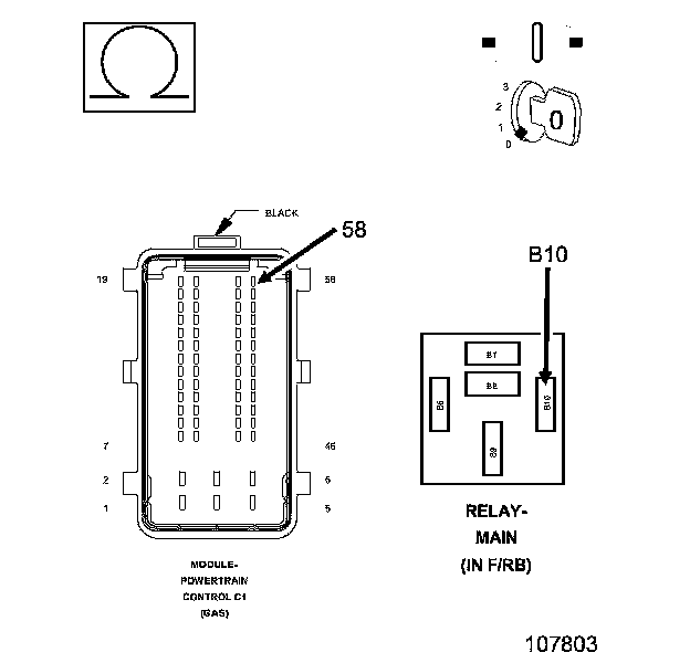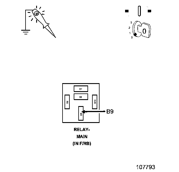 1. Using a 12-volt test light connected to ground, probe the (A935) Fused B+ circuit at the Main Relay terminal.