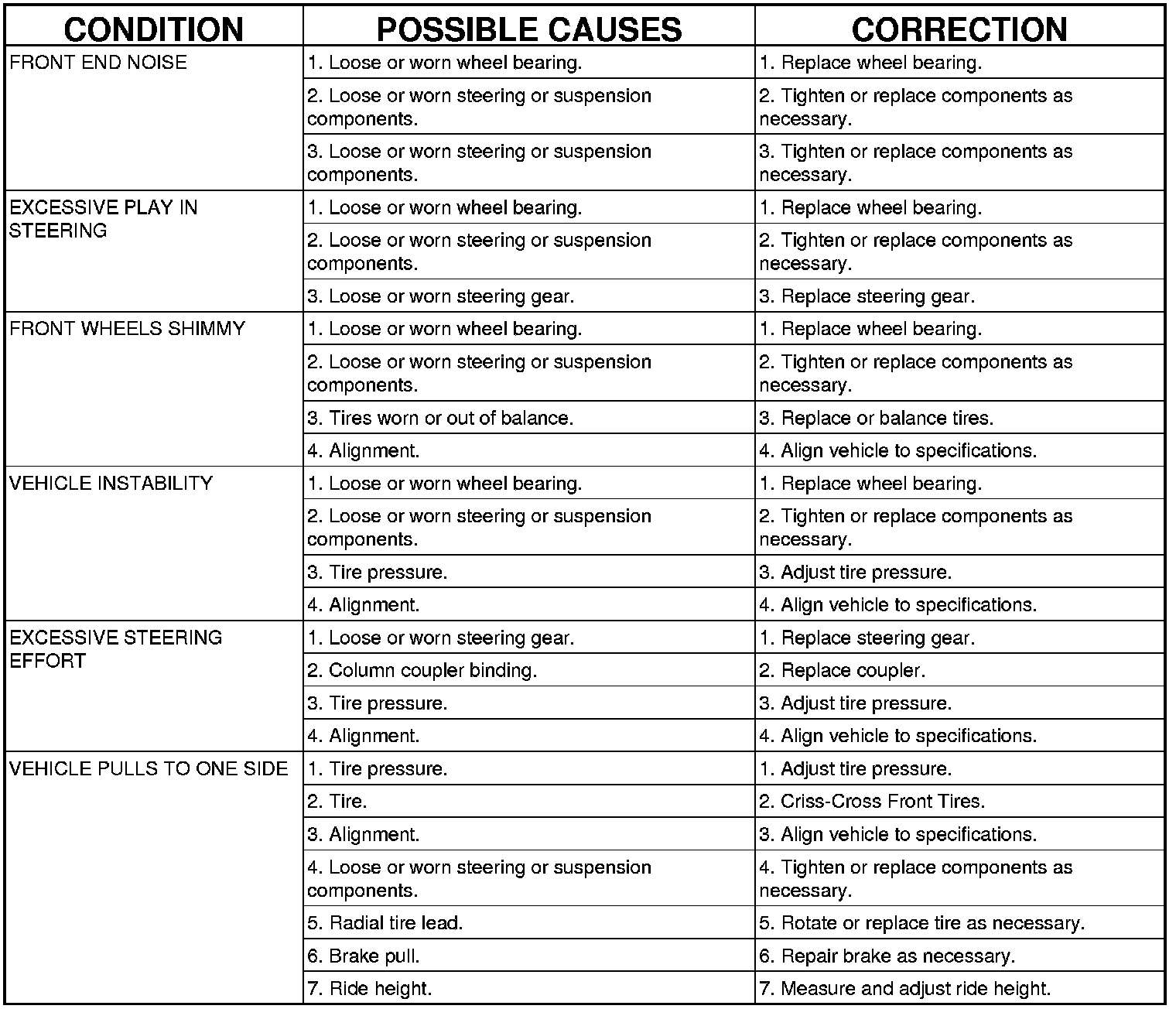 Before starting wheel alignment, the following inspection and necessary corrections must be completed. Refer to Suspension and Steering System Diagnosis Chart below for additional information.