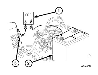 2. Connect volt-ampere tester leads (1 and 2 to the battery terminals. Connect volt-ampere tester lead (3) around the positive battery cable. See instructions provided by manufacturer of volt-ampere tester being used. Note: Certain diesel equipped models use dual batteries. If equipped with dual battery system, tester should be connected to battery on left side of vehicle only. Also, tester current reading must be taken from positive battery cable lead that connects to starter motor.