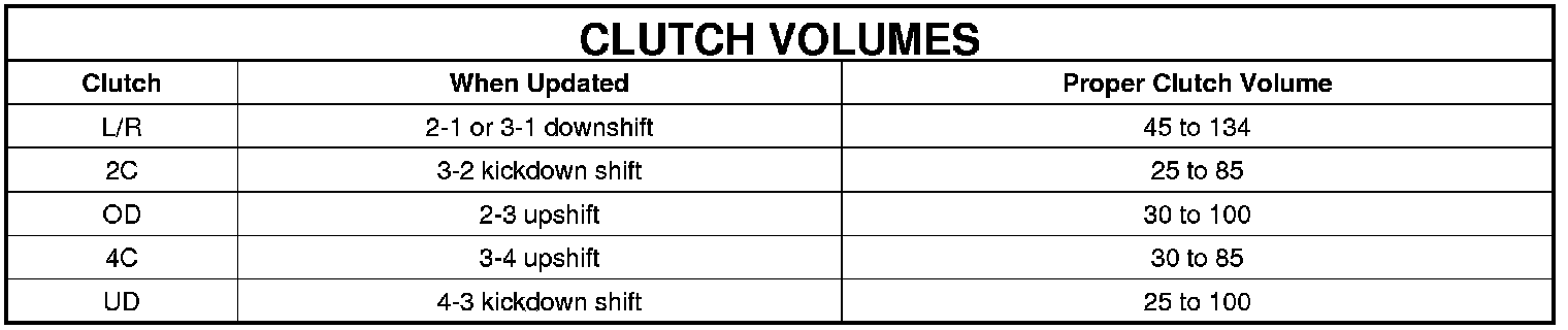 Certain mechanical failures within the input clutch assembly can cause inadequate or out-of-range element volumes. Also, defective Input/Output Speed Sensors and wiring can cause these conditions. The following chart identifies the appropriate clutch volumes and when they are monitored/updated: