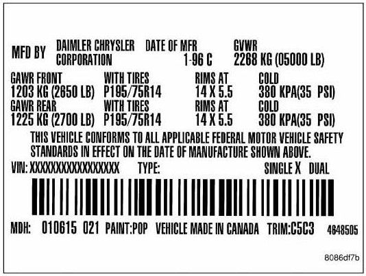 A vehicle certification label is attached to every DaimlerChrysler Corporation vehicle. The label certifies that the vehicle conforms to all applicable Federal Motor Vehicle Standards . The label also lists: