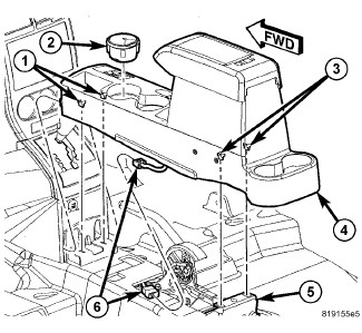 3. Position the front of the console (4) up into the shifter console and position the front clips (1).