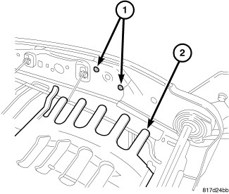 16. Pull the upper support wires (1) down and release the lumbar mat from the seat back frame.
