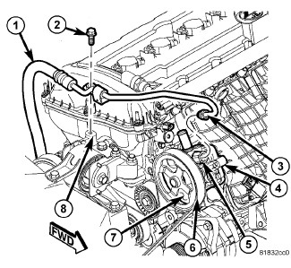 3. Unthread the tube nut (3) and disconnect the power steering pressure hose (1) at the power steering pump pressure fitting (5).