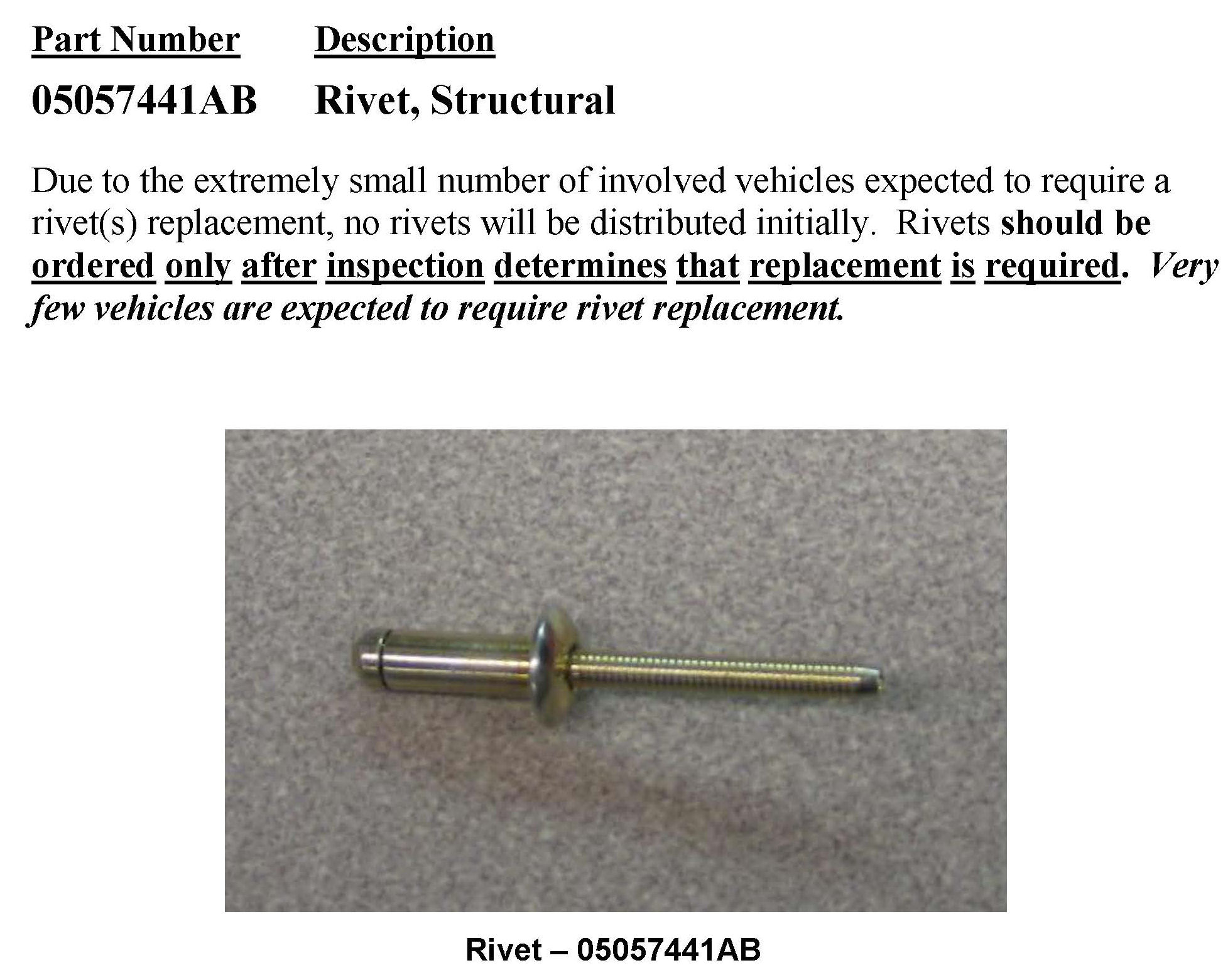 Less than 20 vehicles within the entire vehicle population will have a rivet issue.