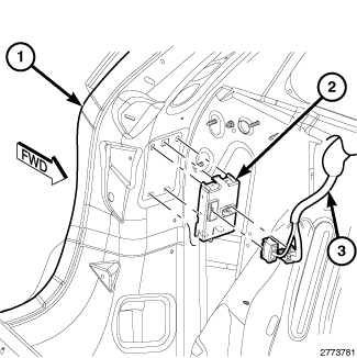 1. Position the Power LiftGate Module (PLGM) (2) to the left lower inner D-pillar (1) in the vehicle.