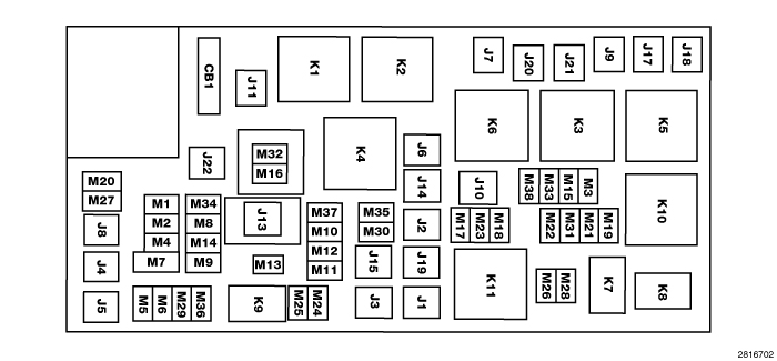 The Totally Integrated Power Module (TIPM) is located in the engine compartment. This center contains cartridge fuses and mini fuses. A description of each fuse and component may be stamped on the inside cover, otherwise the cavity number of each fuse is stamped on the inside cover that corresponds to the following chart.