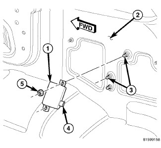 2. Install and tighten the two nuts (5) that secure the module to the studs on the quarter inner panel. Tighten the nuts to 2 Nm (20 in. lbs.).