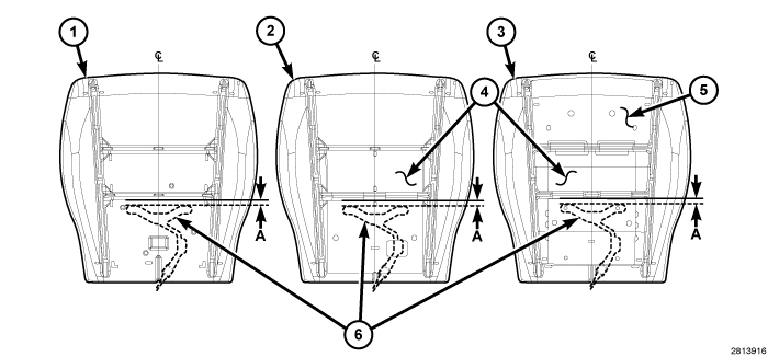 1. Mark the Center Line (CL) of the seat cushion on the top of the seat cushion foam (1) or, if the vehicle is so equipped, on the seat cushion heater element mat (4) of a heated seat (2) or heated and ventilated seat (3).