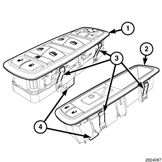 Each switch module housing is secured within the trim panel armrest by four spring clip retainers (3), two on each side of the switch module housing. The passenger side switch module includes a small cubby bin. A connector receptacle (4) integral to the switch module housing connect the switches to the vehicle electrical system through dedicated take outs and connectors of the door wire harness.