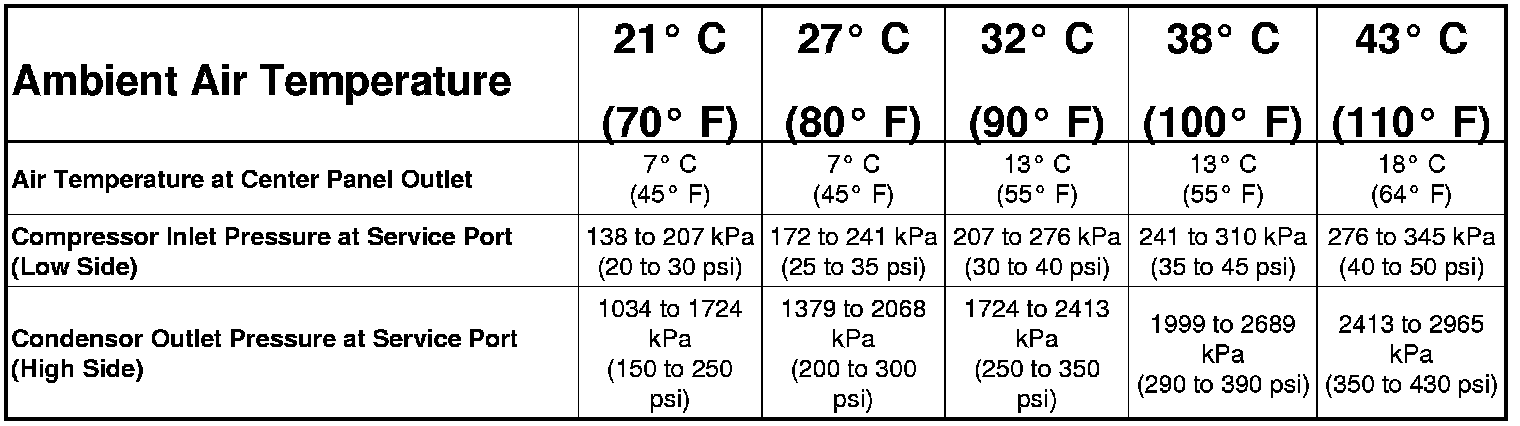 5. With the A/C clutch engaged, compare the air temperature at the center panel outlet and the A/C compressor discharge pressure (high side) to the A/C Performance Temperature and Pressure chart. The A/C clutch may cycle, depending upon the ambient temperature and humidity. If the A/C clutch cycles, use the readings obtained before the clutch disengaged.