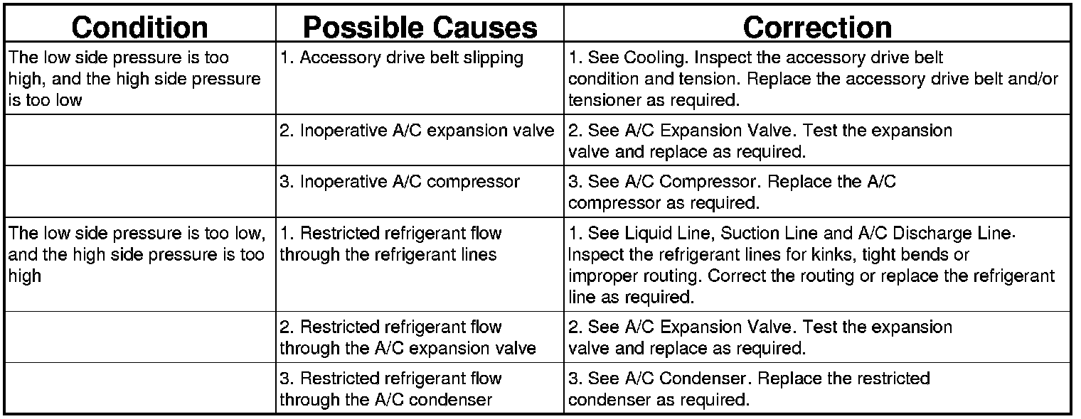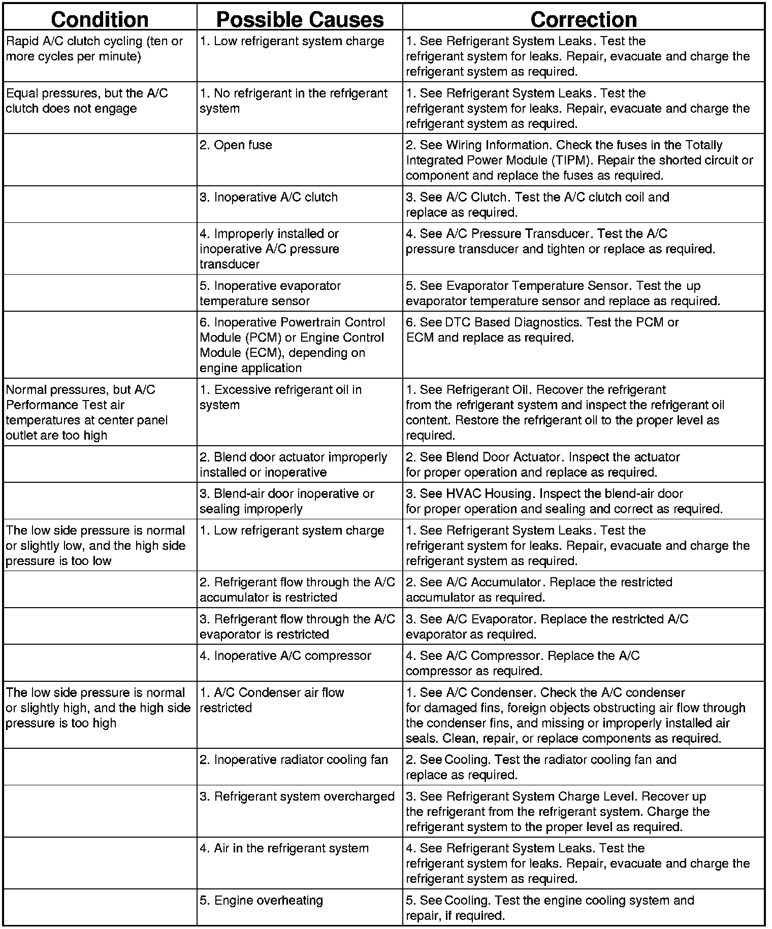 6. If the air outlet temperature fails to meet the specifications in the A/C Performance Temperature and Pressure chart, or if the A/C compressor discharge pressure is high, see the A/C System Diagnosis table.