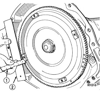 6. Check converter seating with steel scale (1) and straightedge (2). Surface of converter lugs should be at least 13 mm (1/2 in.) to rear of straightedge when converter is fully seated.