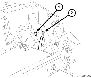 5. Install the nut (1) securing the negative cable (2) to the body ground stud. Tighten the cable nut to 12 Nm (9 ft. lbs.).