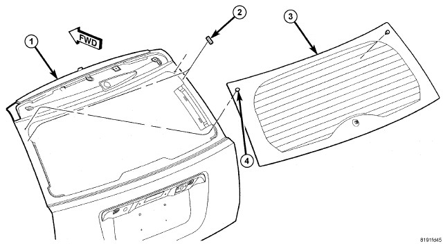 5. Lift liftgate glass into place in the center of the liftgate opening and line up the guide pins (4) to the holes in the liftgate glass frame.