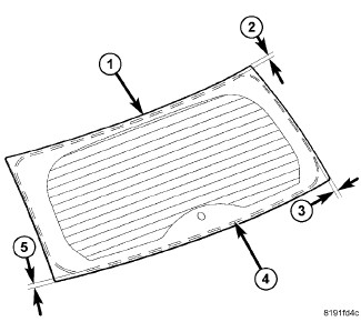 2. Apply bead (4) of adhesive with a triangular nozzle directly to the liftgate glass (1) starting at bottom in center of the liftgate glass.