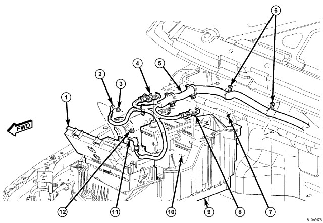 8. Install the nut (12) securing the Totally Integrated Power Module (TIPM) cable (11) to the battery cable stud (5).