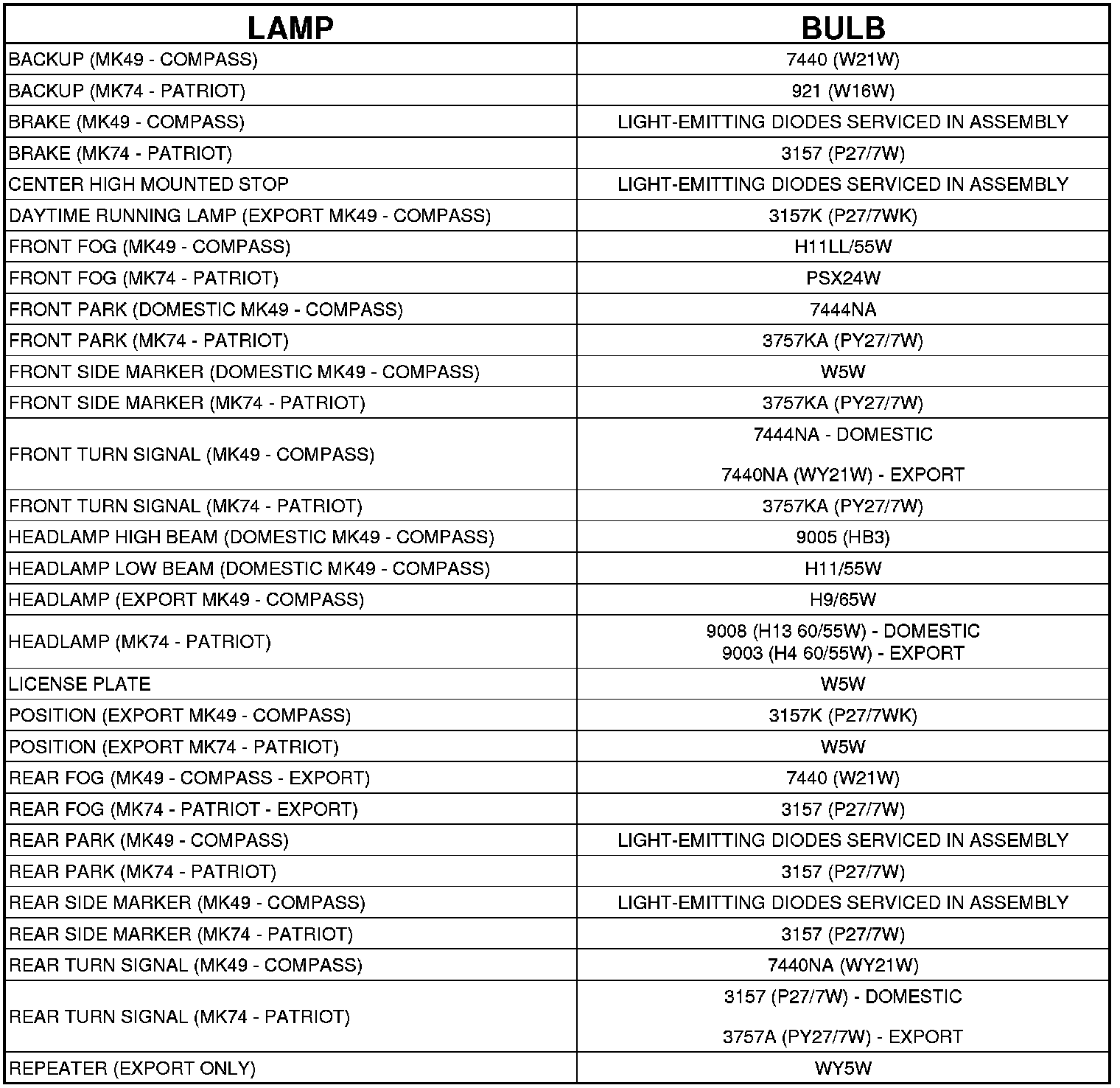 BULB APPLICATION TABLE