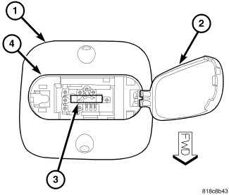 2. Insert the tip of a small flat bladed screwdriver into the notch (4) between the rear dome lamp lens (2) and the housing (1) on the left end of the lens.