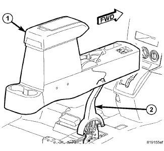 1. Position the console (1) into the vehicle and down over the park break lever (2).