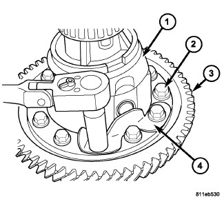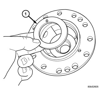 7. Install pinion shaft retainer along with NEW ring gear-to-case bolts (2) tighten bolts to 95 Nm (70 ft. lbs.).
