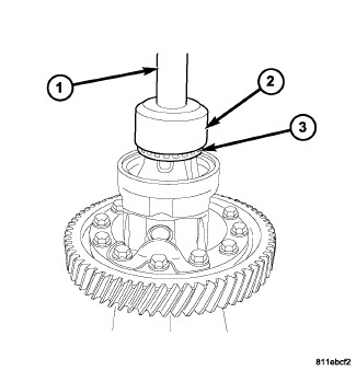 9. Using an arbor press, Handle (1)(Figure 9), and Installer (2), install differential side bearings (3) to case side. If all wheel drive use Bearing Installer to install the large bearing.