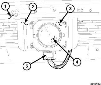 1. Install three new molded plastic ball socket clips into the adaptive speed control (also known as Adaptive Cruise Control/ACC) sensor mounting bracket (2) located below the center of the front bumper support bar (1). The clips are installed from the back side of the bracket by rotating them clockwise.