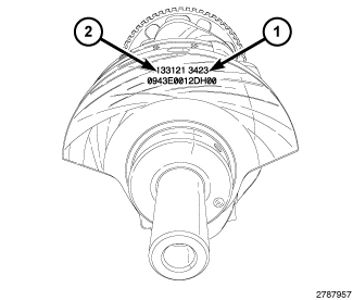 The connecting rod bearings are "select fit" to achieve proper oil clearance. Connecting rod bearing journal diameter grade markings (2) are stamped into the front crankshaft counterweight. These marks are read from left to right, corresponding with journal number 1, 2, 3, 4, 5, 6. Select the bearing size that corresponds to the crankshaft markings for each rod bearing journal.