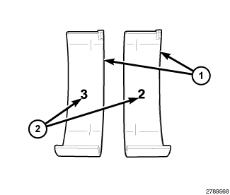 The connecting rod bearing shells (1) are marked with the bearing size (2) on the bearing lining surface. The bearings are available in three different sizes in order to achieve the desired oil clearance.