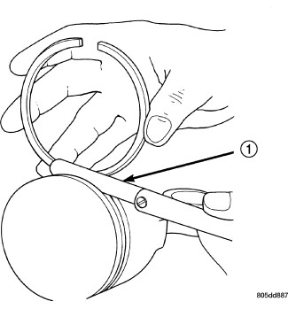 3. Using a feeler gauge (1), check the ring end gap. Replace any rings not within specification.