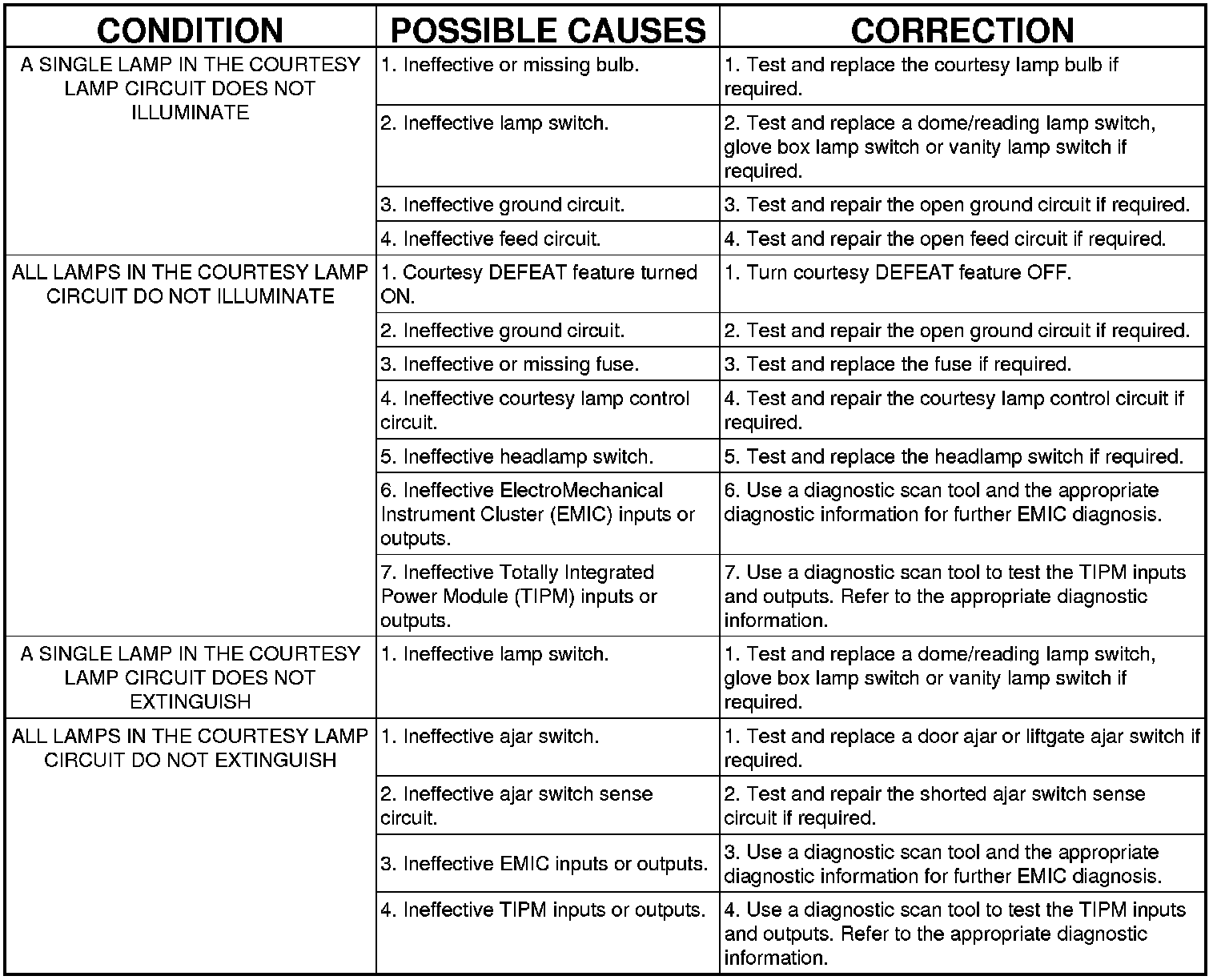 The hard wired circuits between components related to the operation of the interior lighting system may be diagnosed using conventional diagnostic tools and procedures. Refer to the appropriate wiring information. The wiring information includes wiring diagrams, proper wire and connector repair procedures, details of wire harness routing and retention, connector pin-out information and location views for the various wire harness connectors, splices and grounds.